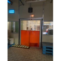 Porte va et vient PVC Composé d une partie haute transaprente 5/6mm et d une partie basse composé d un boyau interne avec une tole fauconné pour la fixation du panneau flexible . Elle garantit l indéformabilité des battants due à la traction du PVC et facilite l entretien L2000 x H2200 épaisseur 5/6mm structure en acier zingué