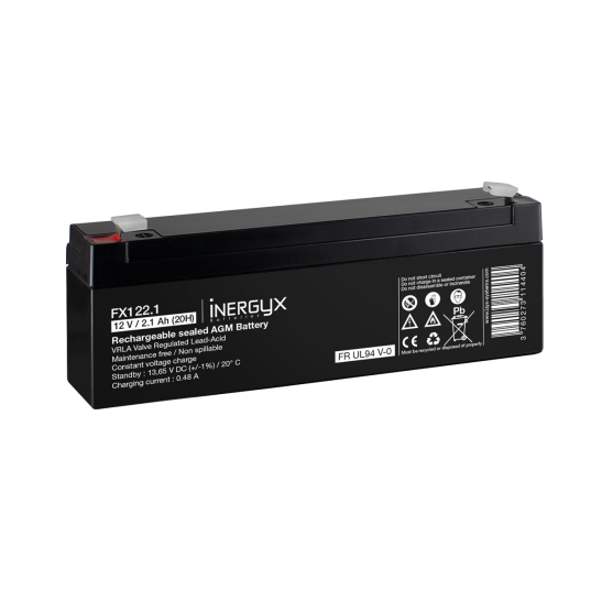 Batterie rechargeable VRLA INERGYX, 12V / 2,1 Ah - Bac FR UL94 V-0 - 178 x 35 x 61/67 mm - Bornes FASTON F1 - 4,75 x 0,8 mm