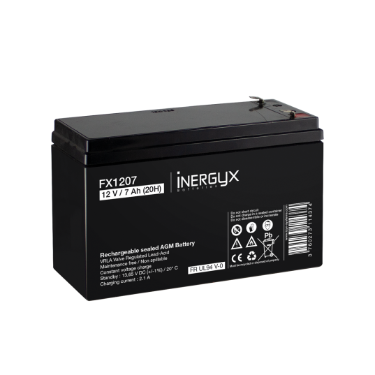 Batterie rechargeable VRLA INERGYX, 12V / 7 Ah - Bac FR UL94 V-0 - 151 x 65 x 94/100 mm - Bornes FASTON F1 - 4,75 x 0,8 mm