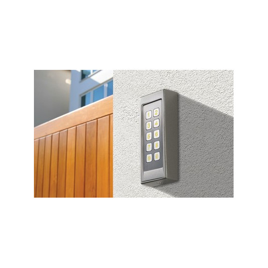 Clavier à code 24V compatible avec n'importe quel récepteur muni d'une entrée « contact sec », qui offre beaucoup d'options complémentaires, à savoir :