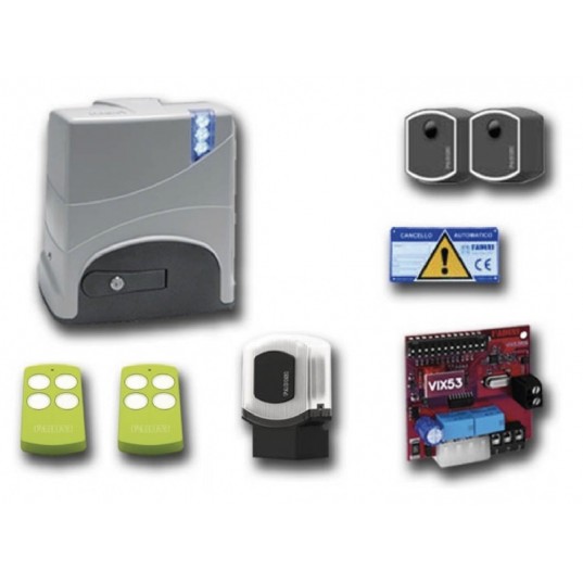 Kit automatisme FADINI JUNIOR 633, 0.33CV, 230Vac, pour portail coulissant poids maximum 600Kg, lubrification à BAIN HUILE - Comprend: 1 x motoréducteur JUNIOR 633L, 1 x lampe de signalisation ZERO.L 152L, 1 x jeu de cellules ZERO.PH 140L, 1 x récepteur radio VIX53 5311L, 2 x télécommandes VIX53 5313GL -