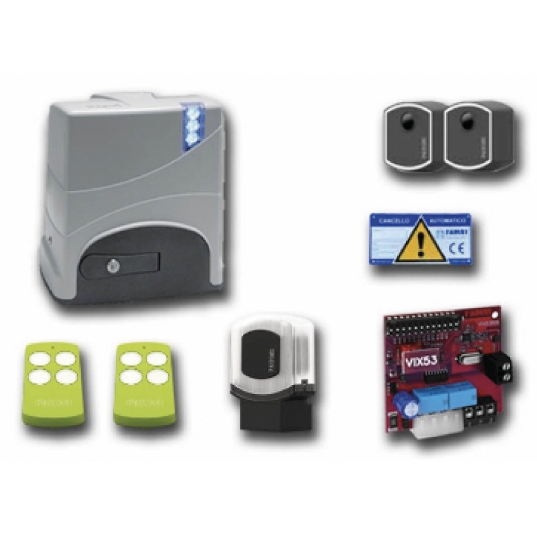 Kit automatisme FADINI JUNIOR 650, 0.5CV, 230Vac, pour portail coulissant poids maximum 1200Kg, lubrification à BAIN HUILE - Comprend: 1 x motoréducteur JUNIOR 650L, 1 x lampe de signalisation ZERO.L 152L, 1 x jeu de cellules ZERO.PH 140L, 1 x récepteur radio VIX53 5311L, 2 x télécommandes VIX53 5313GL -
