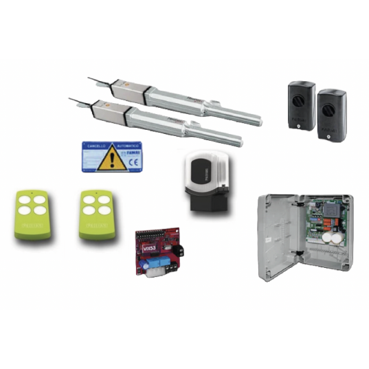 Kit vérins hydrauliques course 240mm FADINI HINDI SPRINT, pour portail double battants PIVOTANTS, dimensions maximum du vantail L2300m, poids 400Kg - Comprend: 2 x vérins HINDI880 SPRINT 888L, 1 x programmateur ELPRO27 7047L, 1 x lampe de signalisation MIRI4 4612L avec antenne 4601L, 1 x jeu de cellules TRIFO11 107L, 1 x récepteur radio VIX53 5311L, 2 x télécommandes VIX53 5313GL -