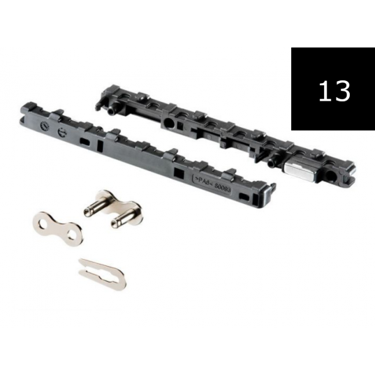 Avec maillon en 3 parties et gabarit de marquage Empêche le fléchissement de la chaîne en cas de rallonge du rail de roulement La fixation s'effectue avec un aimant situé dans l'isolateur ou en option avec le maillon en 3 parties Pour SOMMER base+, pro+, tiga et tiga+, APERTO A550L et A800 XL