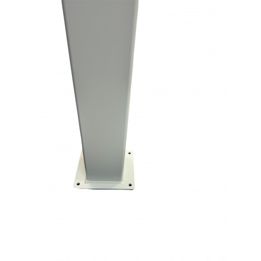 Poteau ALU 150x150x3,5 d épaisseur par 2m de haut BLANC RAL 9010 sur platine 210x250x5mm avec chapeau alu démontable , passage de cable prévu dans la platine , 4 goujons de fixations fournis perçage à 12