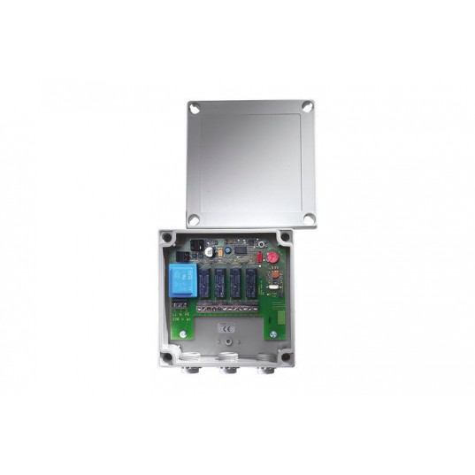 * Adapté aux produits tiers et aux applications spéciales (ne convient pas en tant que commande de moteur tubulaire) * Chaque touche de l'émetteur portatif est associée à un mode de fonctionnement défini du récepteur * Antenne : intégrée ; possibilité de raccorder une antenne externe en option (# 7004) * Mémoire : 448 commandes radio programmables * Alimentation électrique : 230 V c.a. ±10 % ou 24 V c.a./c.c. * Sortie de commande : 4 contacts à relais sans potentiel (inverseur, 8 A, 230 V c.a.) * Entrée du bouton : possibilité de raccordement pour entrée de bouton sans potentiel * Raccordement : par borniers à vis * Câbles compatibles : diamètre jusqu'à 2,5 mm² * Plage de températures : -20°C à +70°C * Dimensions : 130×130×60 mm * Mode de fonctionnement : - Mode impulsion (Tip) : le relais est activé tant qu'il y a un signal radio - Mode commutation (Toggle) : le relais s'allume et s'éteint avec le signal radio, comme pour les relais à impulsions - Définit ON/OFF : commande de mise en marche définie et commande d'arrêt défini - Par temporisation (Time) : le relais est activé par un signal radio et retombe au bout du temps préréglé (1-255 s)